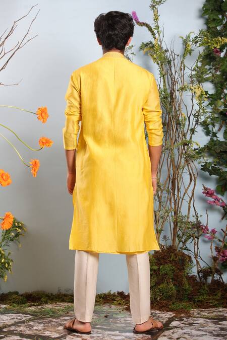 Yellow chanderi kurta with resham, cutdana and floral embroidery.