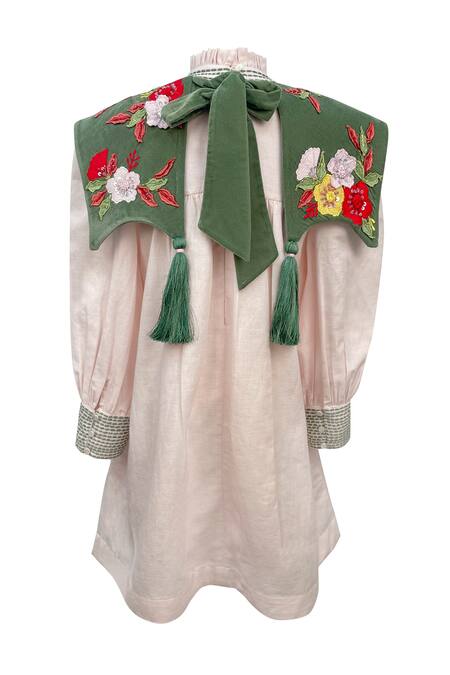 Oversized bib collar with floral embroidery, Tassel detailing on the collar, Tie-up detailing at the back