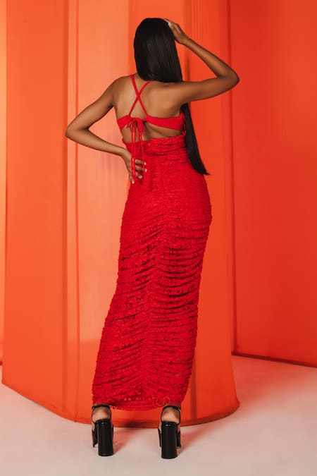 Red lace dress featuring an all-over floral pattern and ruched detailing