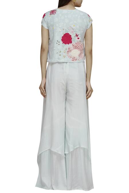 Buy_Itara_Blue Cotton Base Silk Jumpsuit And Jacket Round With Embroidered_Online_at_Aza_Fashions
