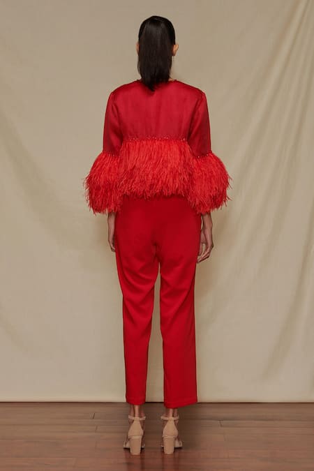 Red jumpsuit in crepe base with side pockets. Comes with floral embroidered jacket with feather hem.