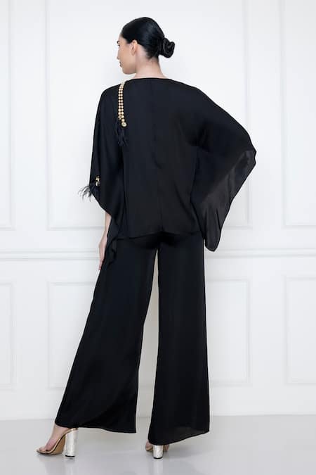 Black cotton satin jumpsuit with pearl & feather tassels. Comes with kaftan top.