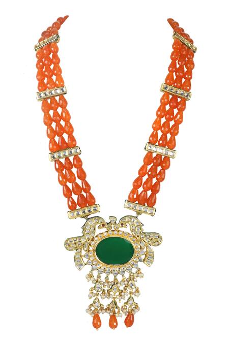 Gold toned long necklace with triple layered orange beaded strings with green stone jadtar pendant.