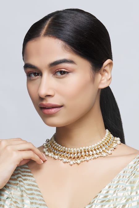 Gold choker featuring encrusted kundan and cluster pearl drops