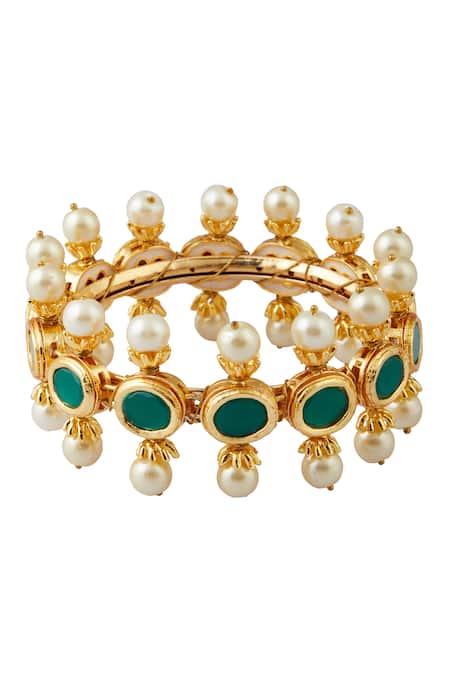 Gold bangle featuring green stone kundans and pearl embellishments