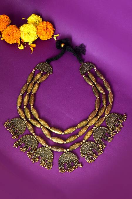 Buy_Just Shradhas_Gold Plated Beads Oxidized Carved Layered Necklace_at_Aza_Fashions