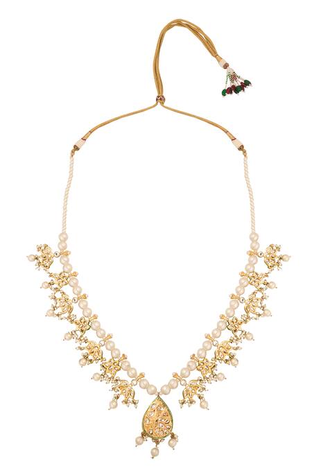 Embellished with a teardrop pendant design, Natural stone units interspersed with pearls, Gold tone metal alloy construction