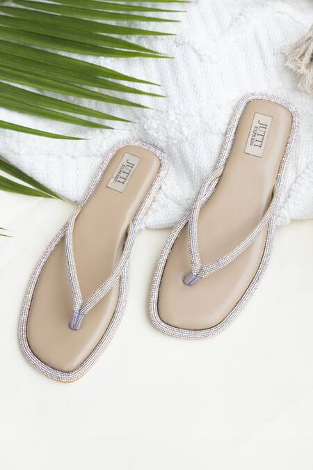 Beige thong strap flats featuring crystal embellishments along the edges