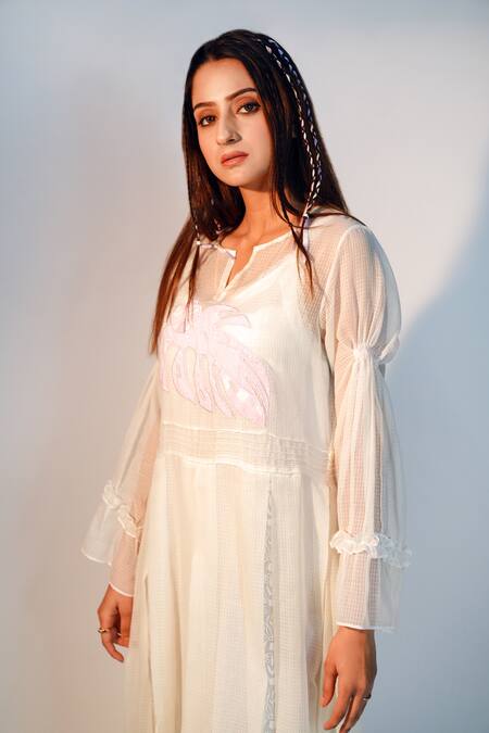 Buy_Jyoti Bansal_White Kota Doria Applique Split V-neck Angel Of Faith Tunic _at_Aza_Fashions