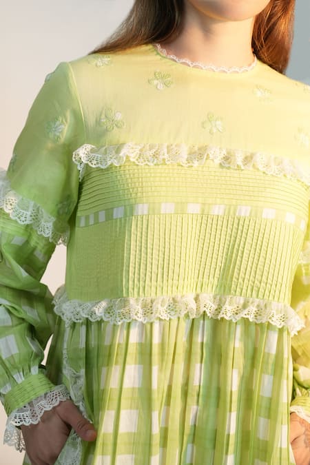 Buy_Jyoti Bansal_Green Cotton Embroidery, Lace Round Neck Chequered Pattern Midi Dress _at_Aza_Fashions
