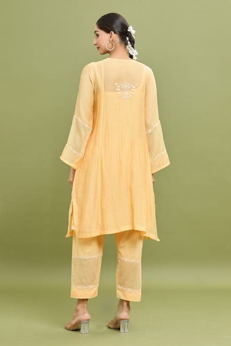 Yellow Chanderi, Kota Doria, Cotton Tassels, Embroidery Split V-neck Kurta Set