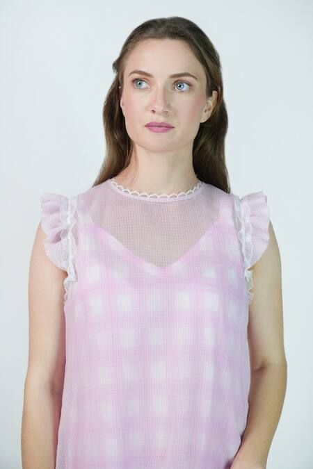 Buy_Jyoti Bansal_Pink Kota Doria Lace, Applique High Neck Dreams Rose Frill Hem Dress _at_Aza_Fashions