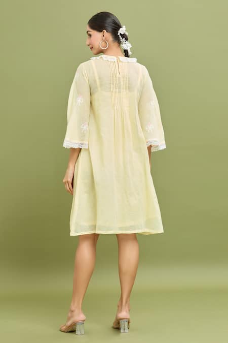 Buy_Jyoti Bansal_Yellow Kota Doria Embroidery Collared Floral Pintuck Dress_Online_at_Aza_Fashions