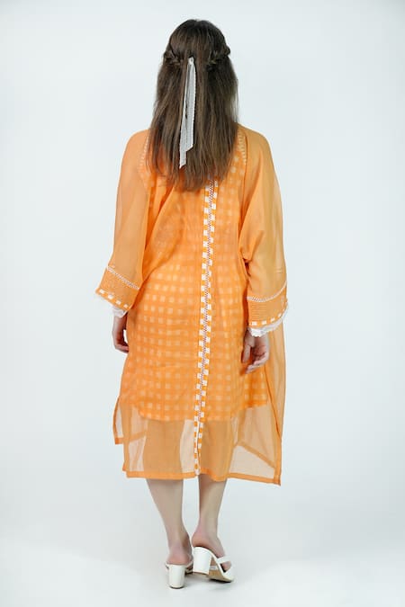 Orange cape featuring sheer sleeves and a scallop trim floral lace embroidered border