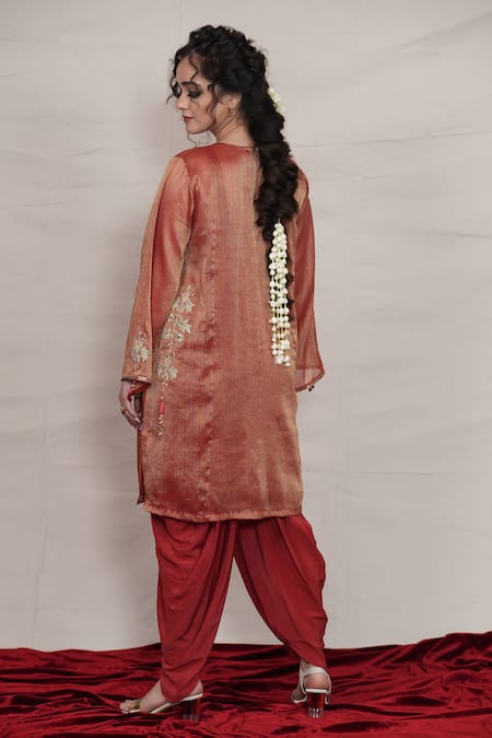 Orange Tissue Mirrors, Zari Floral Placement Embroidered Kurta And Dhoti Pant Set