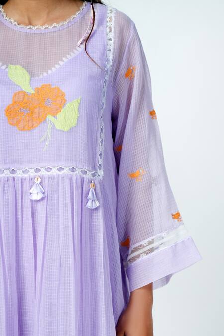 Buy_Jyoti Bansal_Purple Kota Doria Embroidery Round Neck Applique Yoke Tunic _at_Aza_Fashions