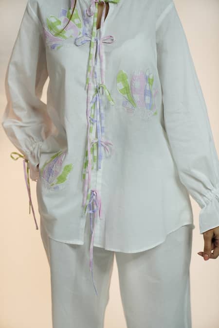 White top featuring a pleated collar and full sleeves with floral applique. Paired with coordinating floral applique pant featuring chequered string tie-ups.