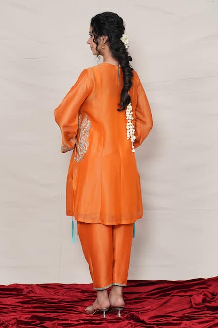 Orange kurta featuring mirror and zari thread placement embroidery with a tassel border. Paired with a slip and salwar, both in matching orange fabric.