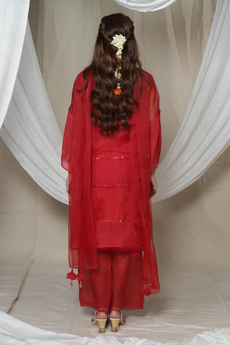 Red Organza, Cotton Mirrors Round Neck Work Embroidered Kurta Pant Set