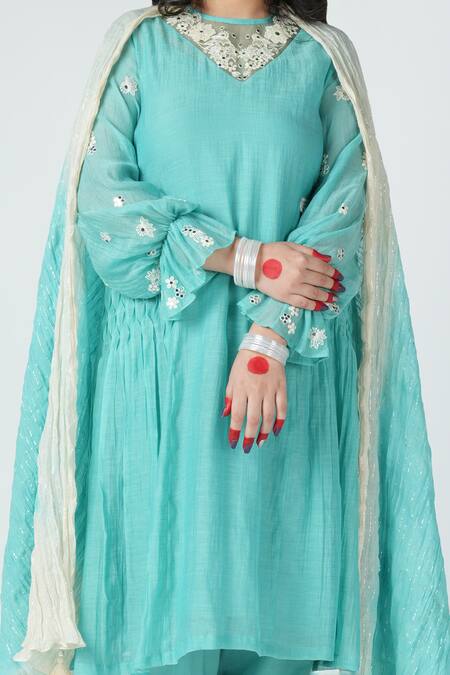 Blue Chanderi, Cotton Embroidery, Mirrors Sabaa Embellished Tunic Salwar Set