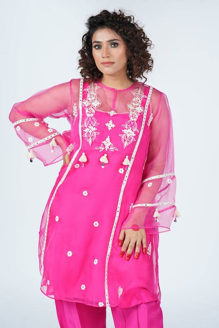Buy_Jyoti Bansal_Pink Organza, Crepe, Chanderi Embroidery Round Neck Sheer Dori Kurta Set _Online_at_Aza_Fashions