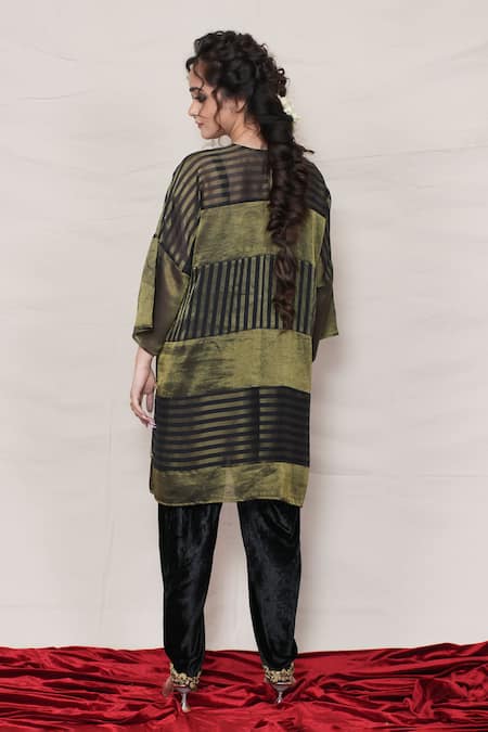 Black Tissue, Velvet Mirrors, Zari Round Stripe Woven Tunic And Tulip Pant Set