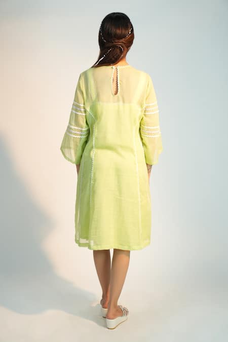 Green Kota Doria Round Neck Sunflower Basil Lace Border Tunic