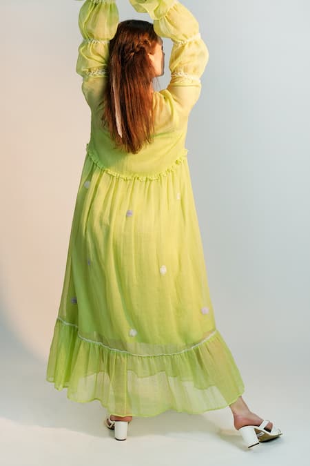 Green maxi dress featuring floral applique motifs, V-neckline, and lace-lined detailing. Includes an inner layer and has an empire waist with a hemline frill.