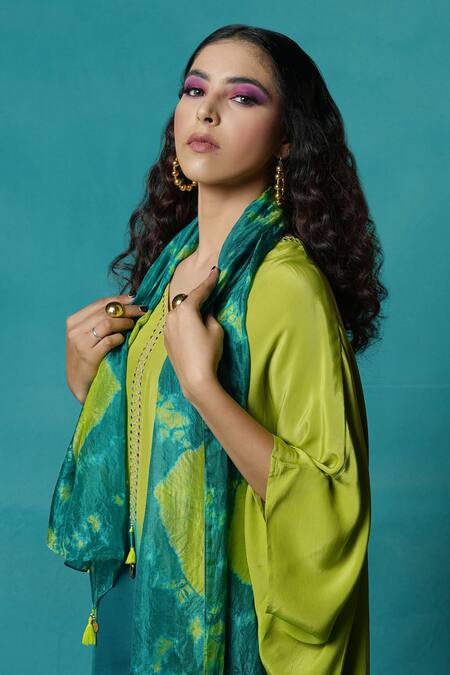 Green tie-dye kurta featuring a V neck, flared sleeves, and an asymmetric hem. Paired with matching palazzo and a crushed pure silk ombre dyed stole with tasselled edges.