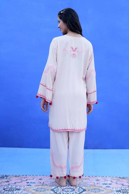 Pom-pom embellishments on sleeves and hem, Tonal thread embroidered floral patterns, Elasticated waistband for comfort