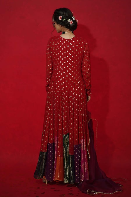 Blood red lurex woven georgette anarkali with embroidered yoke in dori, mirror work, ghungroo embellishment, multi color panels & churidar sleeves. Paired with organza lace bordered dupatta & slip.