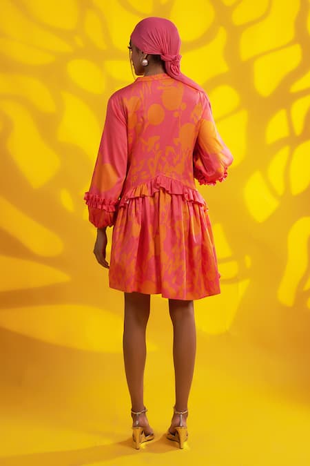 Orange dress featuring abstract prints and ruffles detailing