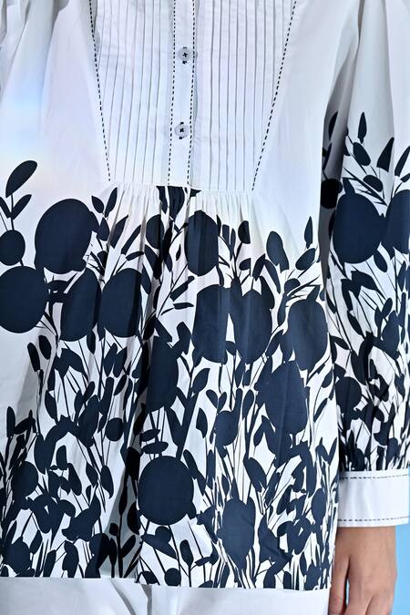 White cotton top featuring floral prints, bishop sleeves, and button detailing. Paired with matching floral printed trousers with pockets.