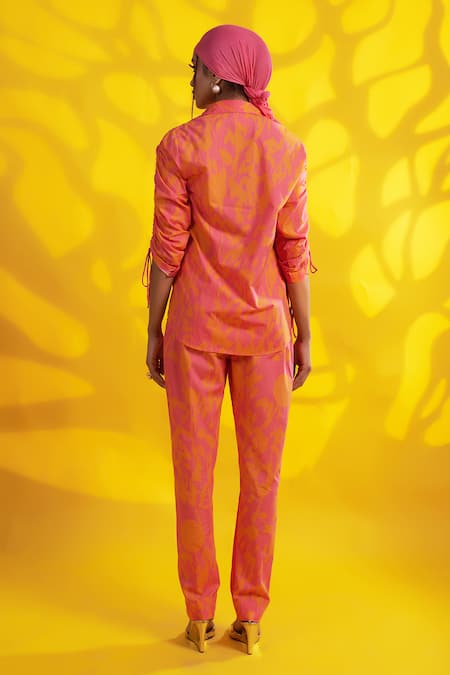 Orange shirt featuring a shirt collar, concealed button placket, and drawstring sleeves. Paired with matching pants that have an abstract print design.