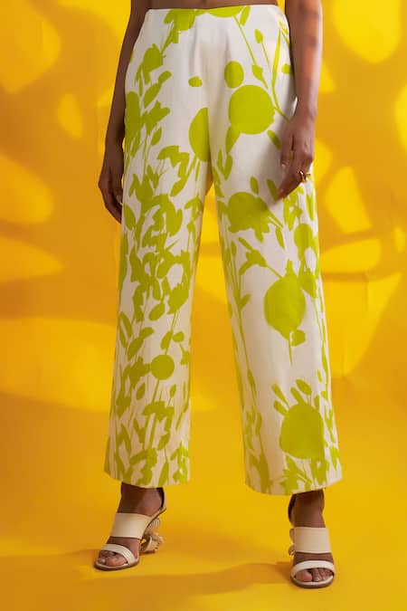 White crop top featuring a round neckline and short sleeves. Paired with printed pant showcasing a floral design in green and white.