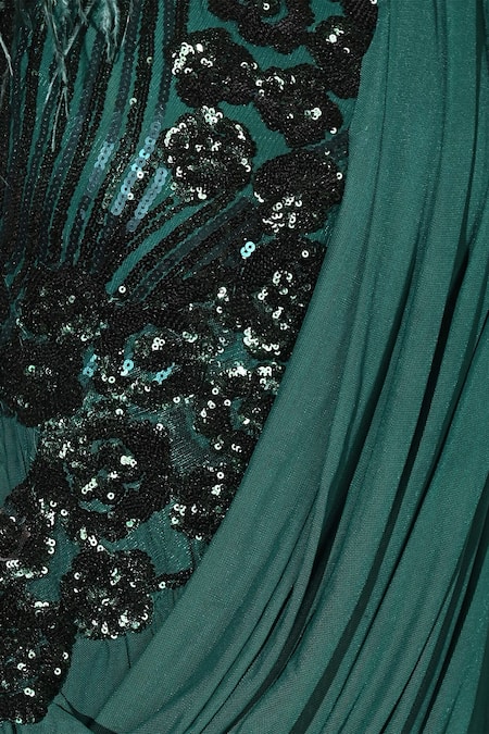 Green Lycra Sequins, Feathers One Shoulder Saree Gown