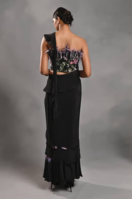 Buy_Jyoti Sachdev Iyer_Black Crepe, Silk Sequins, Feathers Ombre Pre-draped Saree With Corset _Online_at_Aza_Fashions