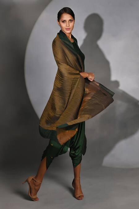 Gold foil print cape featuring stripes on the border. Paired with a green draped jumpsuit with tie-up shoulder straps.