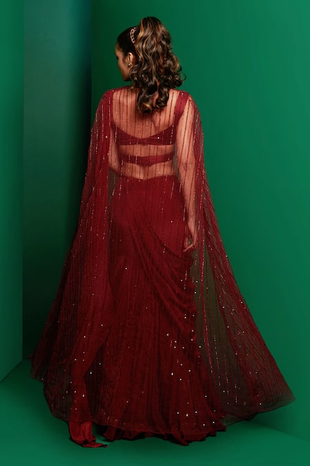 Maroon pre-draped saree featuring a solid mermaid design with pleated cross-body blouse. Accompanied by a sheer cape adorned with bead embellished stripe patterns.