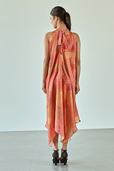 Orange dress featuring an asymmetric hemline and abstract geometric print. Paired with a coordinating front tie-up belt.