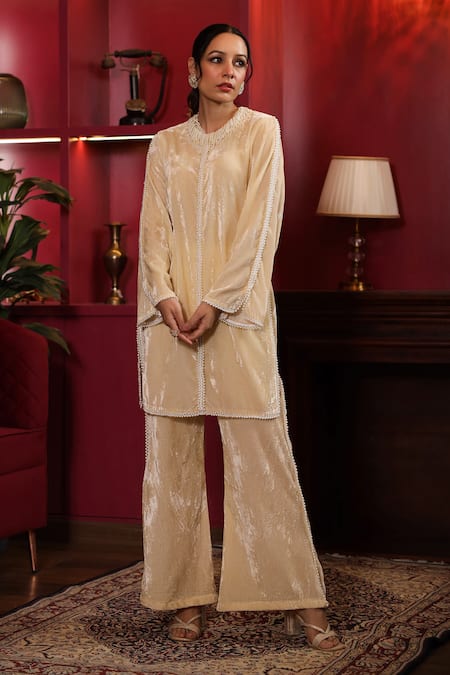 Off white kurta featuring bead embellishment and full sleeves. Paired with coordinating flared pants.