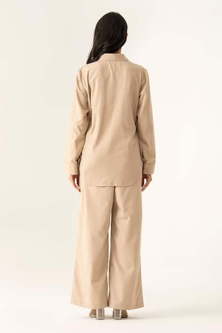 Beige Cotton Embroidery Collared Co-ord Set With Floral