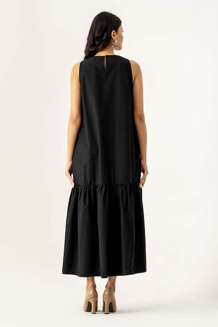 Black midi dress featuring a sleeveless silhouette and gathered hem.