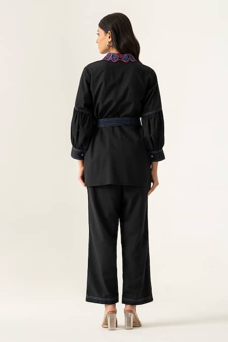 Black Cotton Embroidery, Sequins Collared Puff Sleeve Co-ord Set