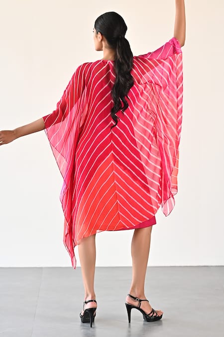 Multi color georgette dress featuring a keyhole round neck and batwing sleeves. Paired with a sweetheart neck inner slip and embellished with beads, sequins, and thread work.