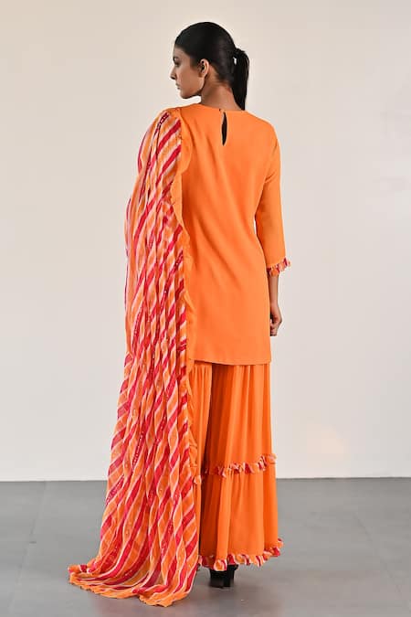 Buy_K-Anshika_Coral Georgette Leheriya Beads Round Neck Chevron Pattern Kurta Set With Dupatta _Online_at_Aza_Fashions