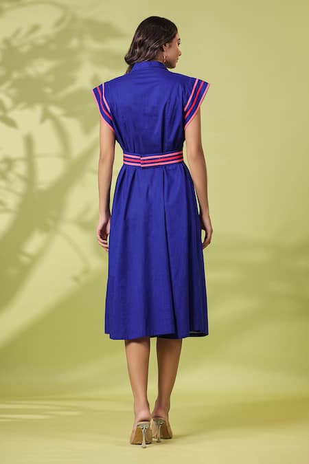 Blue cotton dress featuring resham thread embroidery and a collar neckline. Comes with a matching belt for added style.