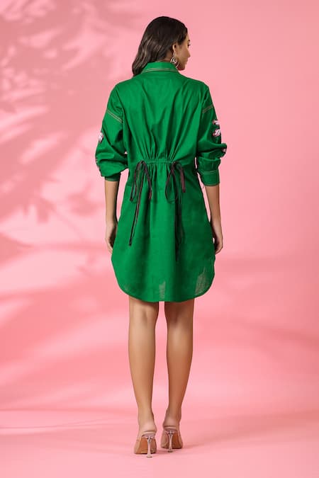 Green Cotton Embroidery Collared Dress