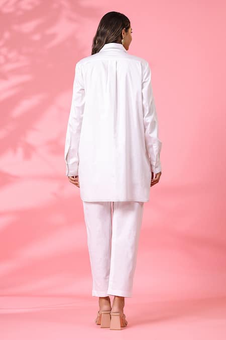 White shirt featuring resham thread embroidery with a collar and full sleeves. Paired with relaxed fit pants featuring an elasticated waistband.