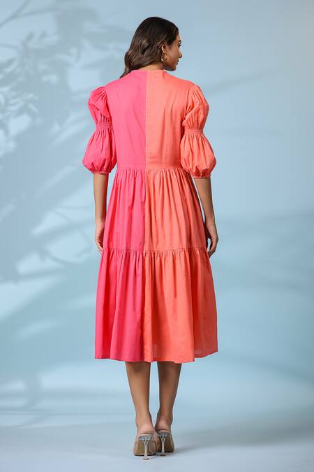 Peach and pink cotton dress featuring resham thread embroidery and puffed sleeves